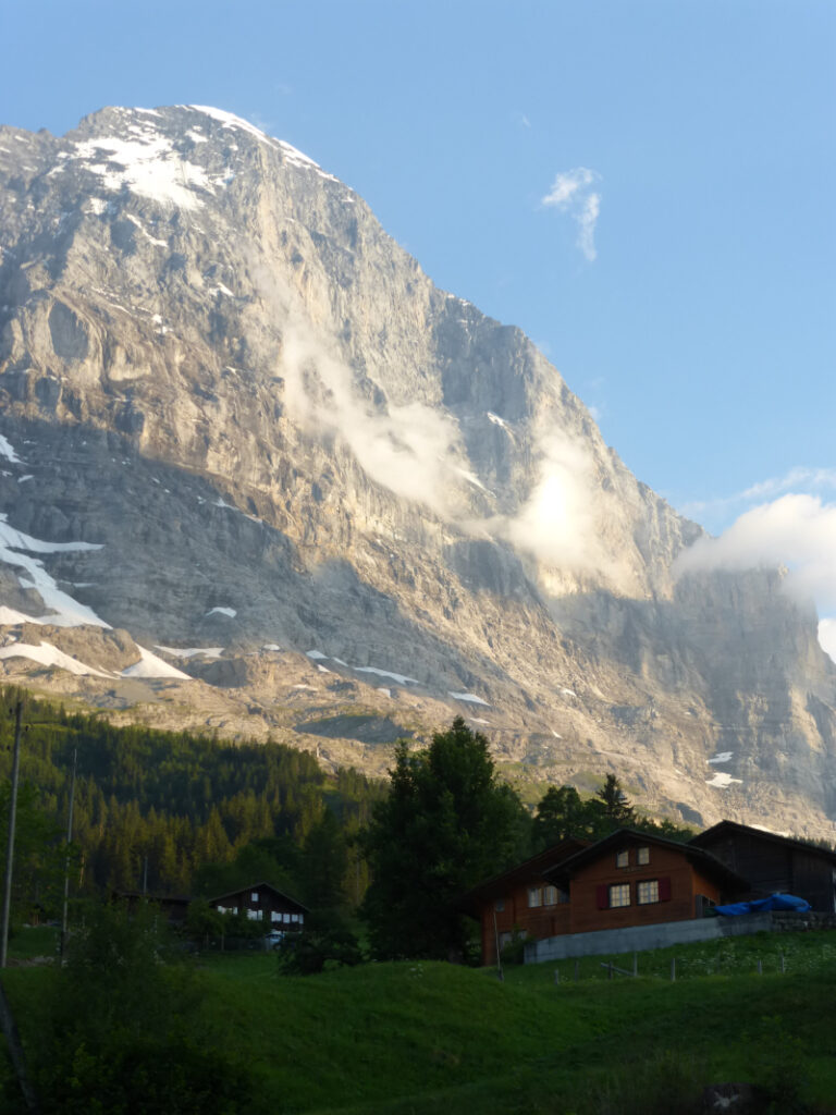 Grindelwald ligt aan de voet van de Eiger, niet de hoogste berg van Zwitserland ( net geen 4.000 m. ), maar wel één met beroemde, dramatische beklimmingen van de steile noordwand. Natuurlijk omdat er mensen bij omgekomen zijn. Volgens Wikipedia 64 tot nog toe. De Eiger rijst in één keer op uit het dal, net als een paar buurbergen van vergelijkbare hoogte, maar zonder een drama waar een film van is gemaakt. Ueli Steck heeft de noordwand keer op keer in een noodtempo beklommen. De laatste keer, in 2015, deed hij er 2 uur en 22 minuten over !