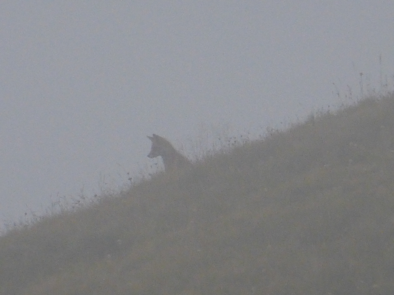We maken een wandeling naar de Bachalpsee. Op de terugweg horen we marmotten gealarmeerd krijsen. Her en der zien we ze rechtop staan. De aanleiding is een vos. Vrij snel valt een wolkendeken het dal in. In de mist lopen we terug naar de kabelbaan.