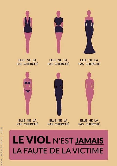 Het tekstblok : verkrachting / aanranding is nooit de fout / de schuld van het slachtoffer.