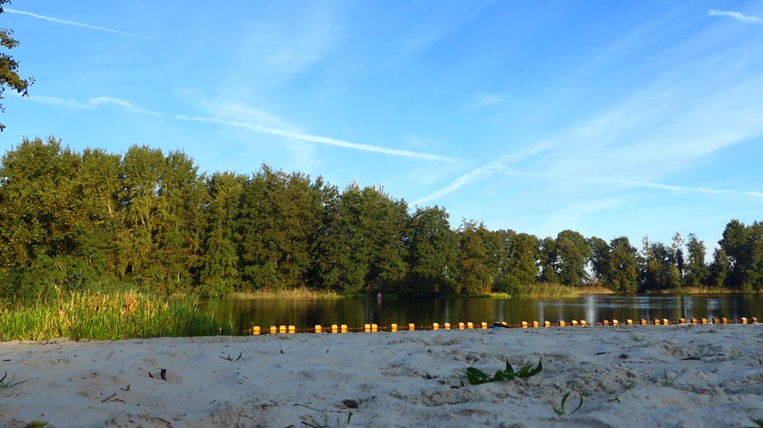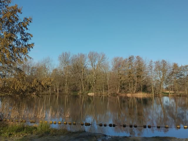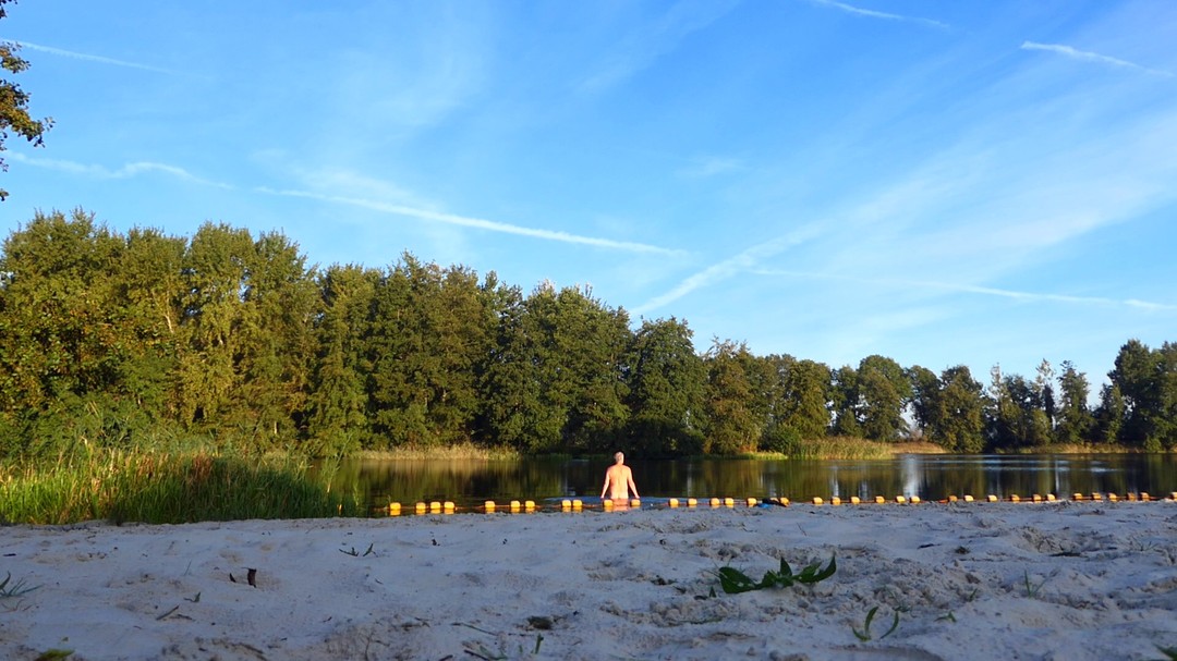 Zwemmen, maar weer eens. Vanaf begin september elke zondag in deze plas en elke woensdag in de vijver in onze wijk en vorige zondag in zee bij Vlieland ( fijne golven ). Die vijver is al flink koud, hij is ondiep, maar deze plas is nog prima te doen. Ik ben naar de overkant gezwommen, als je goed kijk zie je mij als stipje. De zon scheen prachtig op de bomen. Geweldige ochtend